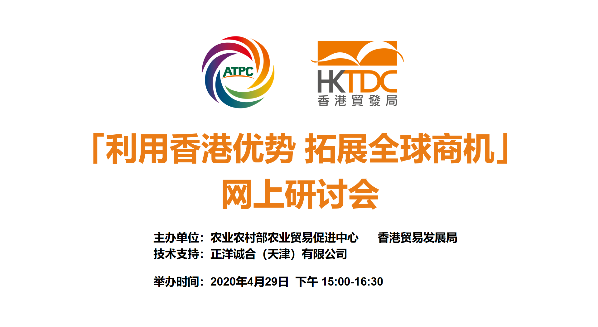 4月29日下午“利用香港優(yōu)勢 拓展全球商機”線上研討會成功舉辦。本次研討會是由農業(yè)農村部農業(yè)貿易促進中心聯(lián)合香港貿易發(fā)展局共同主辦,正洋誠合(天津)有限公司全程技術支持。會議由農業(yè)農村部農業(yè)貿易促進中心副主任宋聚國主持,香港貿易發(fā)展局華北、東北首席代表陳嘉賢致辭。活動通過北京,香港兩地連線,由具有國際化視野的香港專家為企業(yè)帶來了一場耳目一新的饕鬄盛宴,為企業(yè)經營發(fā)展,脫貧攻堅注入新的理念、活力。