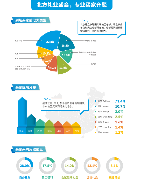 北京作為全國的政治經濟中心,匯聚政商、企事業(yè)機構總部,是華北地區(qū)市場渠道通路中心,擁有大量龍頭生產型、設計與創(chuàng)新能力突出的卓越企業(yè)。消費升級指數(shù)穩(wěn)居國內居民消費水平第一,周邊城市下沉空間巨大,一站式覆蓋全國重點區(qū)域買家,精準高效對接優(yōu)質終端買家。